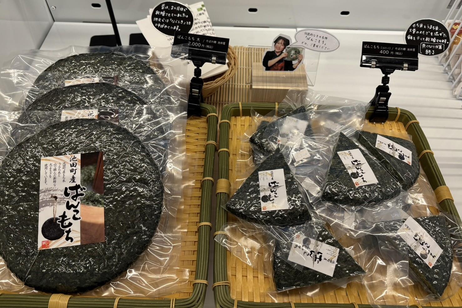 香り高い池田町産オオヨモギがたっぷり入った平べったいお餅で、焼いて食べるとヨモギの風味が存分に感じられます。